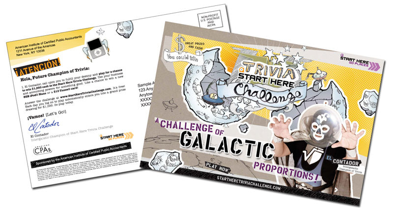We first developed this game promotion — part of the award-winning “Start Here. Go Places.” student recruitment campaign for the American Institute of Certified Public Accountants — around Mexican luchador characters competing for accounting trivia glory. Because it was such a huge hit with students, we took the Trivia Challenge into outer space, b-movie style.